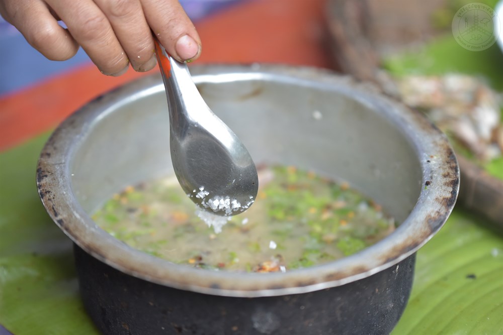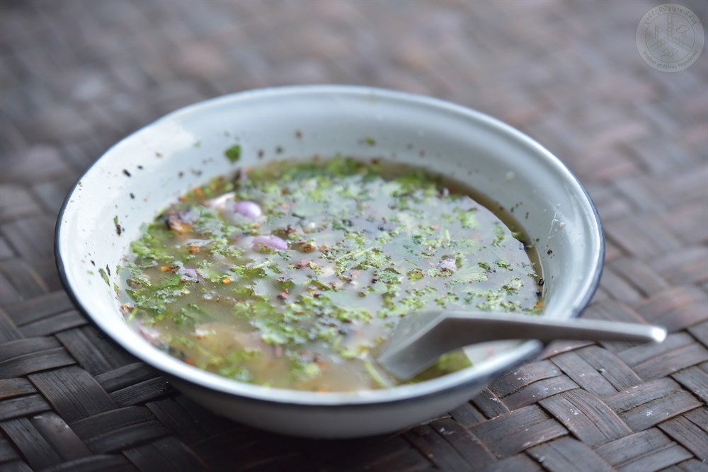 - ทำการซอยข่า หอมแดง ทุบกระเทียม เกลือเม็ด ผักชี เติมรวมกันลงในถ้วยทำการคนให้เข้ากัน แล้วทำการลองชิมว่ารสชาติเป็นอย่างไร ความเค็มใช้ได้ไหม หากทุกอย่างได้ที่แล้วพร้อมรับประทานโดยการซดน้ำต่าจึทีกับข้าวสวยที่ห่อด้วยใบตองจิ่นส่งกลิ่นหอมของใบตอง
