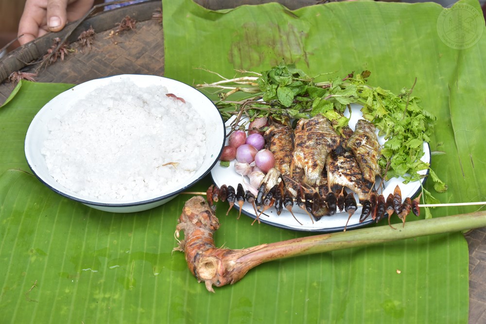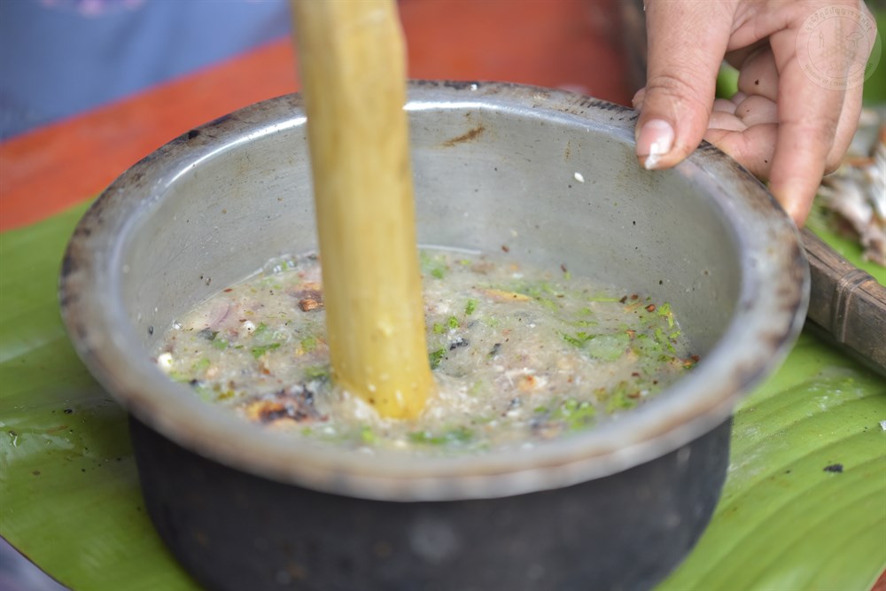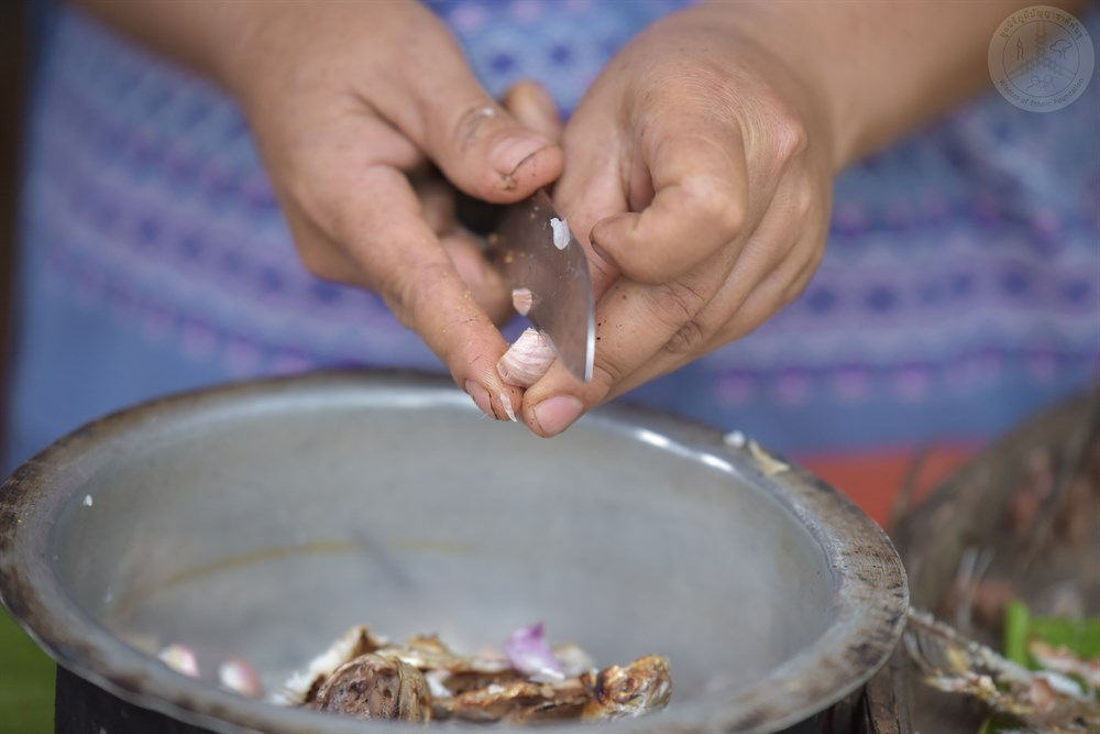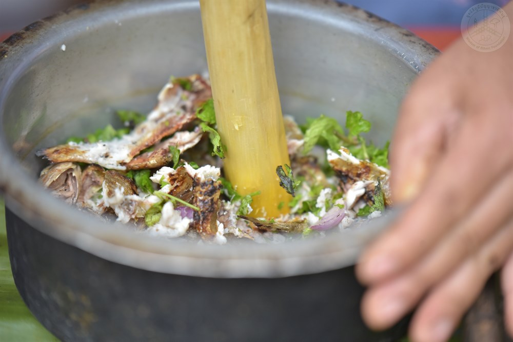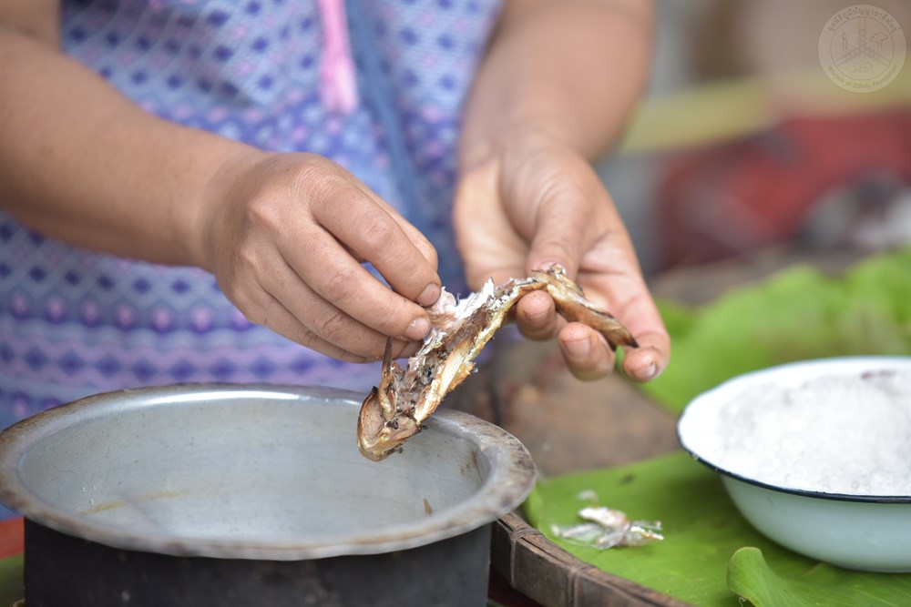 - นำปลาขาวที่ได้จากขุนห้วยในเวลานั้น ทำการย่างให้สุกจนส่งกลิ่นหอมเตะจมูกพร้อมกับนำพริกแห้งเสียบกับไม้มาอางไฟอ่อนๆจนพริกและปลาสุก