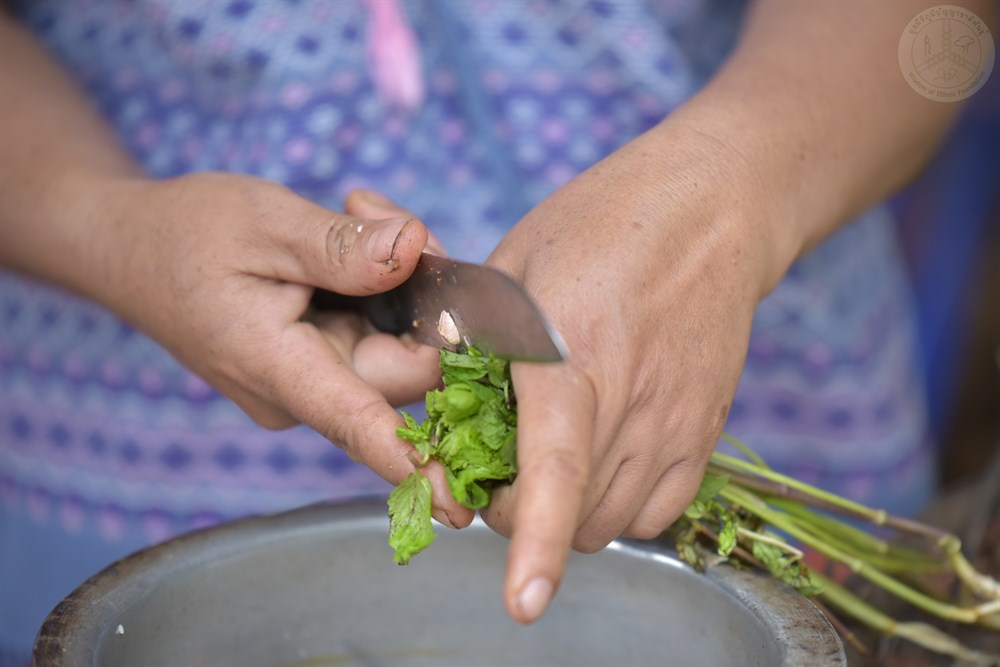 - เตรียมวัสดุรองอาหารคือทำจากใบตองจิ่นหรือใบกล้วยทำการกลัดด้วยไม้เพื่อให้มีลักษณะคล้ายถ้วยเพื่อรองรับอาหารที่เป็นน้ำได้