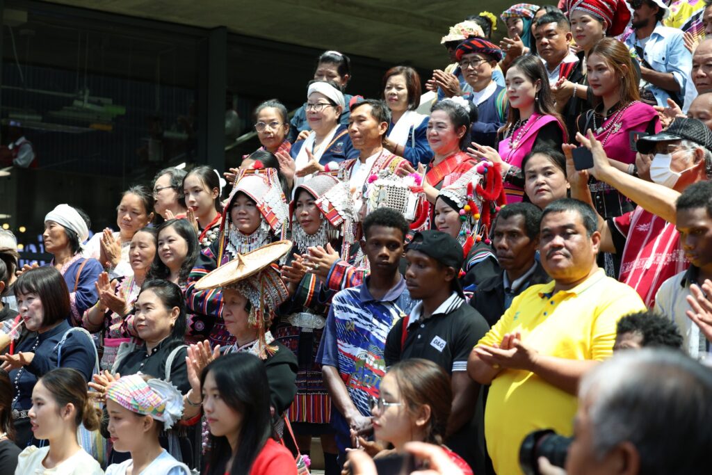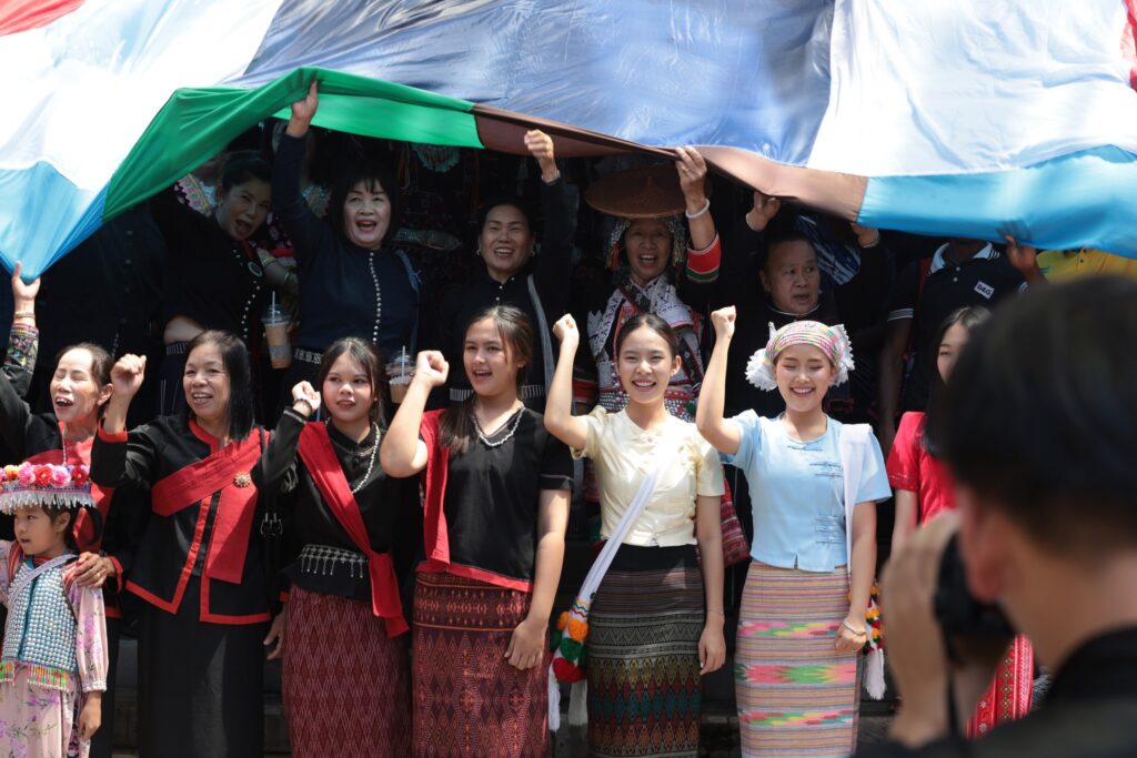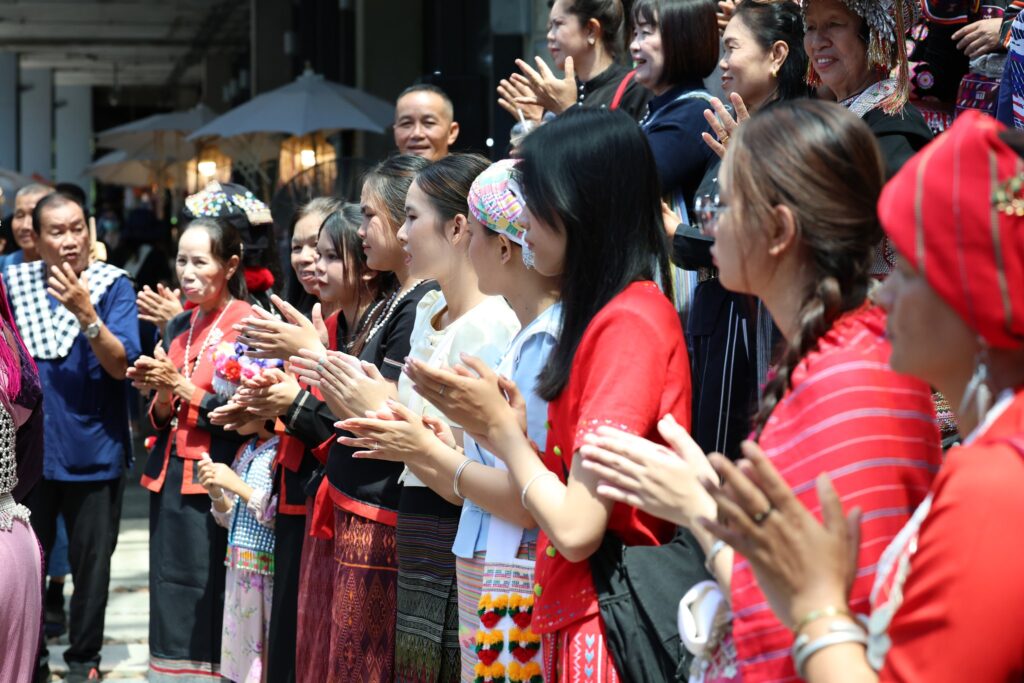 บรรยากาศเต็มไปด้วยสีสันและความหมายเมื่อกลุ่มชาติพันธุ์และชนเผ่าพื้นเมืองร่วมกันนำผ้า “สีน้ำตาล” สัญลักษณ์ของดิน, “สีฟ้า” สัญลักษณ์ของน้ำ และ “สีเขียว” สัญลักษณ์ของป่า มารวมกันเป็นหนึ่งเดียว สะท้อนให้เห็นถึงวิถีชีวิตที่ผูกพันกับธรรมชาติ และความตั้งใจที่จะร่วมกันรักษาทรัพยากรเหล่านี้ไว้ ไม่เพียงเพื่อลูกหลานในอนาคต แต่เพื่อคนไทยทุกคน