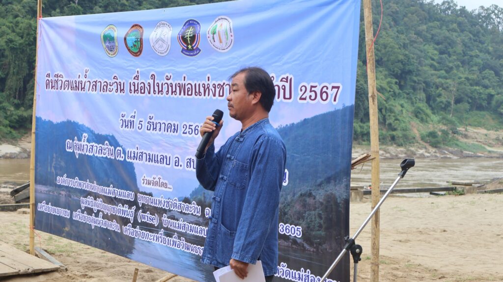 ด้วยมูลนิธิภูมิปัญญาชาติพันธุ์ ร่วมกับชุมชนบ้านแม่สามแลบ บ้านห้วยกองก้าด บ้านท่าตาฝั่ง องค์บริหารส่วนตำบลแม่สามแลบ อุทยานแห่งชาติสาละวิน ฉก.กองร้อยทหารพรานที่ 3605 เครือข่ายลุ่มน้ำสาละวิน เครือข่ายเยาวชนสาละวิน โรงเรียนแม่สามแลบ โรงเรียนแม่กองก้าด ร่วมงานวันพ่อแห่งชาติ ในงาน “คืนชีวิตแม่น้ำสาละวิน” ครั้งที่ 3 ” โดยมีวัตถุประสงค์การจัดดังนี้ 1. เพื่อแสดงถึงความจงรักภักดีและน้อมรำลึกถึงพระกรุณาธิคุณอันหาที่สุดมิได้ของพระบาทสมเด็จพระบรมชนกาธิเบศร มหาภูมิพลอดุยเดชมหาราช บรมนาถบพิตร ในหลวงรัชกาลที่ ๙ เนื่องในโอกาสวันพ่อแห่งชาติประจำปี 2567 2. เพื่อการอนุรักษ์ทรัพยากรธรรมชาติ ดิน น้ำ ป่า และความหลากหลายทางชีวภาพที่มีอยู่ในพื้นที่ให้มีความอุดมสมบูรณ์และยั่งยืน 3. เพื่อรณรงค์ให้รู้รักษาปกป้องแม่น้ำสาละวินปราศจากขยะมูลฝอยและคืนชีวิตน้ำสาละวินให้สะอาดซึ่งในงานผู้เข้าร่วมจำนวน 140 คน